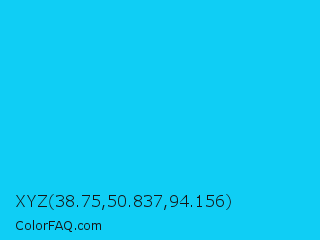 XYZ 38.75,50.837,94.156 Color is a normal cyan color and the nearest color is Spiro Disco Ball #0fc0fc. Hex code #0fcef5 and RGB value is rgb(15,206,245). In RGB color space, this color is composed of 6% red, 81% green, 96% blue, In CMYK color space, this color is composed of 94% cyan, 16% magenta, 0% yellow , 4% black , In HSL color space, this color has a hue angle of 190° , 92% saturation and 51% lightness.