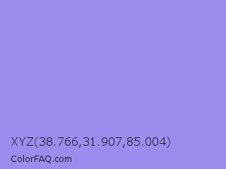 XYZ 38.766,31.907,85.004 Color is a light indigo color and the nearest color is Dull Lavender #a899e6. Hex code #9e8bee and RGB value is rgb(158,139,238). In RGB color space, this color is composed of 62% red, 55% green, 93% blue, In CMYK color space, this color is composed of 34% cyan, 42% magenta, 0% yellow , 7% black , In HSL color space, this color has a hue angle of 252° , 74% saturation and 74% lightness.