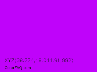 XYZ 38.774,18.044,91.882 Color is a normal purple color and the nearest color is Electric Purple #bf00ff. Hex code #bf03fa and RGB value is rgb(191,3,250). In RGB color space, this color is composed of 75% red, 1% green, 98% blue, In CMYK color space, this color is composed of 24% cyan, 99% magenta, 0% yellow , 2% black , In HSL color space, this color has a hue angle of 286° , 98% saturation and 50% lightness.