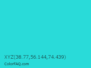 XYZ 38.77,56.144,74.439 Color is a normal cyan color and the nearest color is Turquoise PWG #30d5c8. Hex code #29dbd9 and RGB value is rgb(41,219,217). In RGB color space, this color is composed of 16% red, 86% green, 85% blue, In CMYK color space, this color is composed of 81% cyan, 0% magenta, 1% yellow , 14% black , In HSL color space, this color has a hue angle of 179° , 71% saturation and 51% lightness.