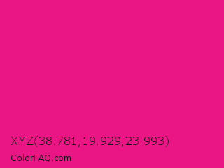 XYZ 38.781,19.929,23.993 Color is a normal rose color and the nearest color is Barbie Pink #e0218a. Hex code #eb1685 and RGB value is rgb(235,22,133). In RGB color space, this color is composed of 92% red, 9% green, 52% blue, In CMYK color space, this color is composed of 0% cyan, 91% magenta, 43% yellow , 8% black , In HSL color space, this color has a hue angle of 329° , 84% saturation and 50% lightness.