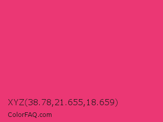 XYZ 38.78,21.655,18.659 Color is a normal rose color and the nearest color is Cerise Pink #ec3b83. Hex code #eb3774 and RGB value is rgb(235,55,116). In RGB color space, this color is composed of 92% red, 22% green, 45% blue, In CMYK color space, this color is composed of 0% cyan, 77% magenta, 51% yellow , 8% black , In HSL color space, this color has a hue angle of 340° , 82% saturation and 57% lightness.