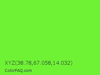 XYZ 38.78,67.058,14.032 Color is a normal green color and the nearest color is Spring Frost #87ff2a. Hex code #6ef233 and RGB value is rgb(110,242,51). In RGB color space, this color is composed of 43% red, 95% green, 20% blue, In CMYK color space, this color is composed of 55% cyan, 0% magenta, 79% yellow , 5% black , In HSL color space, this color has a hue angle of 101° , 88% saturation and 57% lightness.