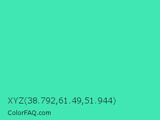 XYZ 38.792,61.49,51.944 Color is a normal green color and the nearest color is Eucalyptus #44d7a8. Hex code #41e7b2 and RGB value is rgb(65,231,178). In RGB color space, this color is composed of 25% red, 91% green, 70% blue, In CMYK color space, this color is composed of 72% cyan, 0% magenta, 23% yellow , 9% black , In HSL color space, this color has a hue angle of 161° , 78% saturation and 58% lightness.