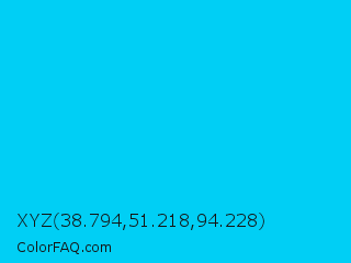 XYZ 38.794,51.218,94.228 Color is a normal cyan color and the nearest color is Vivid Sky Blue #00ccff. Hex code #00cff5 and RGB value is rgb(0,207,245). In RGB color space, this color is composed of 0% red, 81% green, 96% blue, In CMYK color space, this color is composed of 100% cyan, 16% magenta, 0% yellow , 4% black , In HSL color space, this color has a hue angle of 189° , 100% saturation and 48% lightness.