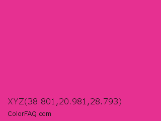 XYZ 38.801,20.981,28.793 Color is a normal rose color and the nearest color is Cerise #da3287. Hex code #e63091 and RGB value is rgb(230,48,145). In RGB color space, this color is composed of 90% red, 19% green, 57% blue, In CMYK color space, this color is composed of 0% cyan, 79% magenta, 37% yellow , 10% black , In HSL color space, this color has a hue angle of 328° , 78% saturation and 55% lightness.