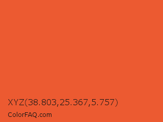 XYZ 38.803,25.367,5.757 Color is a normal red color and the nearest color is Flamingo #f2552a. Hex code #ec5a31 and RGB value is rgb(236,90,49). In RGB color space, this color is composed of 93% red, 35% green, 19% blue, In CMYK color space, this color is composed of 0% cyan, 62% magenta, 79% yellow , 7% black , In HSL color space, this color has a hue angle of 13° , 83% saturation and 56% lightness.