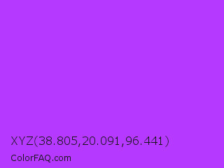 XYZ 38.805,20.091,96.441 Color is a light purple color and the nearest color is Veronica #a020f0. Hex code #b639ff and RGB value is rgb(182,57,255). In RGB color space, this color is composed of 71% red, 22% green, 100% blue, In CMYK color space, this color is composed of 29% cyan, 78% magenta, 0% yellow , 0% black , In HSL color space, this color has a hue angle of 278° , 100% saturation and 61% lightness.