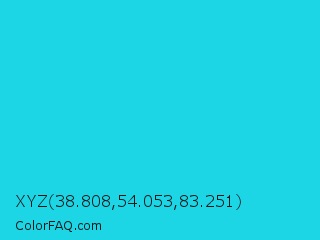 XYZ 38.808,54.053,83.251 Color is a normal cyan color and the nearest color is Bright Turquoise #08e8de. Hex code #1cd6e6 and RGB value is rgb(28,214,230). In RGB color space, this color is composed of 11% red, 84% green, 90% blue, In CMYK color space, this color is composed of 88% cyan, 7% magenta, 0% yellow , 10% black , In HSL color space, this color has a hue angle of 185° , 80% saturation and 51% lightness.
