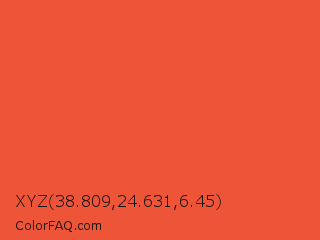 XYZ 38.809,24.631,6.45 Color is a normal red color and the nearest color is Carmine Pink #eb4c42. Hex code #ed5438 and RGB value is rgb(237,84,56). In RGB color space, this color is composed of 93% red, 33% green, 22% blue, In CMYK color space, this color is composed of 0% cyan, 65% magenta, 76% yellow , 7% black , In HSL color space, this color has a hue angle of 9° , 83% saturation and 57% lightness.