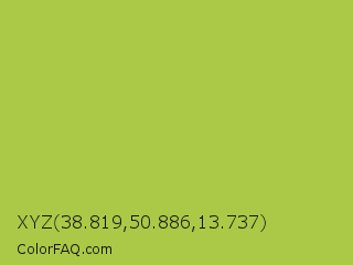 XYZ 38.819,50.886,13.737 Color is a normal lime color and the nearest color is Android Green #a4c639. Hex code #abc947 and RGB value is rgb(171,201,71). In RGB color space, this color is composed of 67% red, 79% green, 28% blue, In CMYK color space, this color is composed of 15% cyan, 0% magenta, 65% yellow , 21% black , In HSL color space, this color has a hue angle of 74° , 55% saturation and 53% lightness.