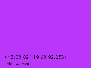 XYZ 38.824,19.98,92.253 Color is a normal purple color and the nearest color is Veronica #a020f0. Hex code #ba36fa and RGB value is rgb(186,54,250). In RGB color space, this color is composed of 73% red, 21% green, 98% blue, In CMYK color space, this color is composed of 26% cyan, 78% magenta, 0% yellow , 2% black , In HSL color space, this color has a hue angle of 280° , 95% saturation and 60% lightness.
