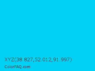 XYZ 38.827,52.012,91.997 Color is a normal cyan color and the nearest color is Vivid Sky Blue #00ccff. Hex code #00d1f2 and RGB value is rgb(0,209,242). In RGB color space, this color is composed of 0% red, 82% green, 95% blue, In CMYK color space, this color is composed of 100% cyan, 14% magenta, 0% yellow , 5% black , In HSL color space, this color has a hue angle of 188° , 100% saturation and 47% lightness.