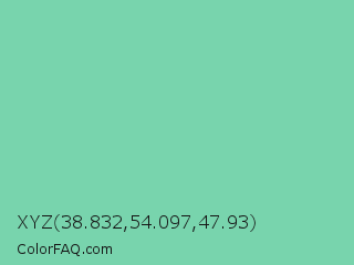 XYZ 38.832,54.097,47.93 Color is a light green color and the nearest color is Medium Aquamarine #66ddaa. Hex code #78d4ad and RGB value is rgb(120,212,173). In RGB color space, this color is composed of 47% red, 83% green, 68% blue, In CMYK color space, this color is composed of 43% cyan, 0% magenta, 18% yellow , 17% black , In HSL color space, this color has a hue angle of 155° , 52% saturation and 65% lightness.