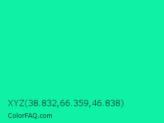 XYZ 38.832,66.359,46.838 Color is a normal green color and the nearest color is Medium Spring Green #00fa9a. Hex code #0ff2a6 and RGB value is rgb(15,242,166). In RGB color space, this color is composed of 6% red, 95% green, 65% blue, In CMYK color space, this color is composed of 94% cyan, 0% magenta, 31% yellow , 5% black , In HSL color space, this color has a hue angle of 160° , 90% saturation and 50% lightness.