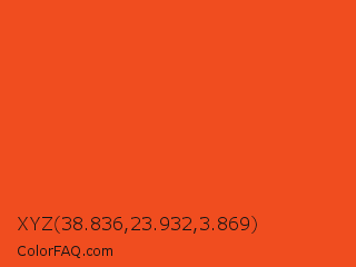 XYZ 38.836,23.932,3.869 Color is a normal red color and the nearest color is Pomegranate #f34723. Hex code #f04d1f and RGB value is rgb(240,77,31). In RGB color space, this color is composed of 94% red, 30% green, 12% blue, In CMYK color space, this color is composed of 0% cyan, 68% magenta, 87% yellow , 6% black , In HSL color space, this color has a hue angle of 13° , 87% saturation and 53% lightness.