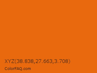 XYZ 38.838,27.663,3.708 Color is a normal orange color and the nearest color is Christine #e7730a. Hex code #e96a0e and RGB value is rgb(233,106,14). In RGB color space, this color is composed of 91% red, 42% green, 5% blue, In CMYK color space, this color is composed of 0% cyan, 55% magenta, 94% yellow , 9% black , In HSL color space, this color has a hue angle of 25° , 89% saturation and 48% lightness.
