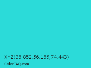 XYZ 38.852,56.186,74.443 Color is a normal cyan color and the nearest color is Turquoise PWG #30d5c8. Hex code #2bdbd9 and RGB value is rgb(43,219,217). In RGB color space, this color is composed of 17% red, 86% green, 85% blue, In CMYK color space, this color is composed of 80% cyan, 0% magenta, 1% yellow , 14% black , In HSL color space, this color has a hue angle of 179° , 71% saturation and 51% lightness.