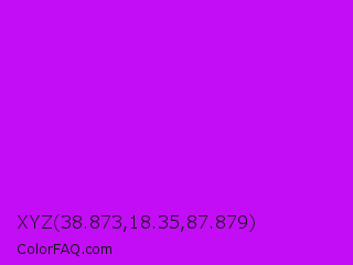 XYZ 38.873,18.35,87.879 Color is a normal purple color and the nearest color is Electric Purple #bf00ff. Hex code #c20df5 and RGB value is rgb(194,13,245). In RGB color space, this color is composed of 76% red, 5% green, 96% blue, In CMYK color space, this color is composed of 21% cyan, 95% magenta, 0% yellow , 4% black , In HSL color space, this color has a hue angle of 287° , 92% saturation and 51% lightness.