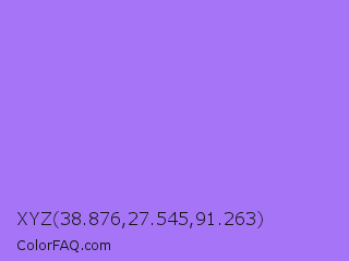 XYZ 38.876,27.545,91.263 Color is a light violet color and the nearest color is Lavender #b57edc. Hex code #a675f7 and RGB value is rgb(166,117,247). In RGB color space, this color is composed of 65% red, 46% green, 97% blue, In CMYK color space, this color is composed of 33% cyan, 53% magenta, 0% yellow , 3% black , In HSL color space, this color has a hue angle of 263° , 89% saturation and 71% lightness.