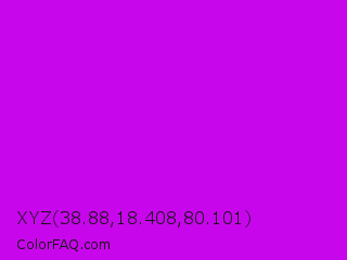 XYZ 38.88,18.408,80.101 Color is a normal purple color and the nearest color is Vivid Mulberry #b80ce3. Hex code #c806eb and RGB value is rgb(200,6,235). In RGB color space, this color is composed of 78% red, 2% green, 92% blue, In CMYK color space, this color is composed of 15% cyan, 97% magenta, 0% yellow , 8% black , In HSL color space, this color has a hue angle of 291° , 95% saturation and 47% lightness.