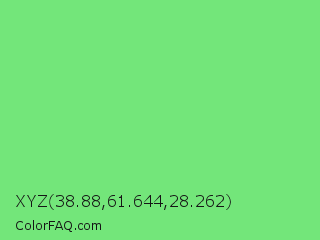 XYZ 38.88,61.644,28.262 Color is a light green color and the nearest color is Pastel Green #77dd77. Hex code #73e67a and RGB value is rgb(115,230,122). In RGB color space, this color is composed of 45% red, 90% green, 48% blue, In CMYK color space, this color is composed of 50% cyan, 0% magenta, 47% yellow , 10% black , In HSL color space, this color has a hue angle of 124° , 70% saturation and 68% lightness.