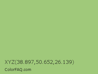 XYZ 38.897,50.652,26.139 Color is a light green color and the nearest color is Pistachio #93c572. Hex code #a0c97a and RGB value is rgb(160,201,122). In RGB color space, this color is composed of 63% red, 79% green, 48% blue, In CMYK color space, this color is composed of 20% cyan, 0% magenta, 39% yellow , 21% black , In HSL color space, this color has a hue angle of 91° , 42% saturation and 63% lightness.
