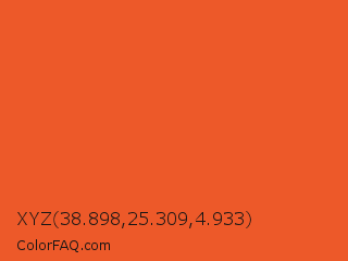 XYZ 38.898,25.309,4.933 Color is a normal color and the nearest color is Flamingo #f2552a. Hex code #ed5929 and RGB value is rgb(237,89,41). In RGB color space, this color is composed of 93% red, 35% green, 16% blue, In CMYK color space, this color is composed of 0% cyan, 62% magenta, 83% yellow , 7% black , In HSL color space, this color has a hue angle of 15° , 84% saturation and 55% lightness.