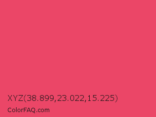 XYZ 38.899,23.022,15.225 Color is a normal red color and the nearest color is Paradise Pink #e63e62. Hex code #eb4667 and RGB value is rgb(235,70,103). In RGB color space, this color is composed of 92% red, 27% green, 40% blue, In CMYK color space, this color is composed of 0% cyan, 70% magenta, 56% yellow , 8% black , In HSL color space, this color has a hue angle of 348° , 80% saturation and 60% lightness.