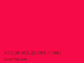 XYZ 38.902,20.084,7.788 Color is a normal rose color and the nearest color is Red Ribbon #ed0a3f. Hex code #f50a47 and RGB value is rgb(245,10,71). In RGB color space, this color is composed of 96% red, 4% green, 28% blue, In CMYK color space, this color is composed of 0% cyan, 96% magenta, 71% yellow , 4% black , In HSL color space, this color has a hue angle of 344° , 92% saturation and 50% lightness.