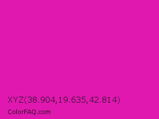 XYZ 38.904,19.635,42.814 Color is a normal magenta color and the nearest color is Frostbite #e936a7. Hex code #e018b0 and RGB value is rgb(224,24,176). In RGB color space, this color is composed of 88% red, 9% green, 69% blue, In CMYK color space, this color is composed of 0% cyan, 89% magenta, 21% yellow , 12% black , In HSL color space, this color has a hue angle of 314° , 81% saturation and 49% lightness.