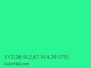 XYZ 38.912,67.914,39.075 Color is a normal green color and the nearest color is Medium Spring Green #00fa9a. Hex code #29f594 and RGB value is rgb(41,245,148). In RGB color space, this color is composed of 16% red, 96% green, 58% blue, In CMYK color space, this color is composed of 83% cyan, 0% magenta, 40% yellow , 4% black , In HSL color space, this color has a hue angle of 151° , 91% saturation and 56% lightness.