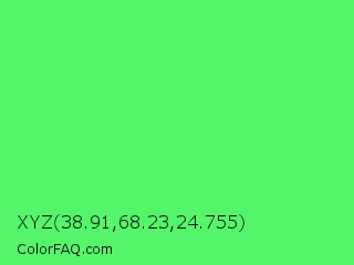 XYZ 38.91,68.23,24.755 Color is a light green color and the nearest color is Screamin Green #66ff66. Hex code #54f56a and RGB value is rgb(84,245,106). In RGB color space, this color is composed of 33% red, 96% green, 42% blue, In CMYK color space, this color is composed of 66% cyan, 0% magenta, 57% yellow , 4% black , In HSL color space, this color has a hue angle of 128° , 89% saturation and 65% lightness.