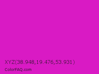 XYZ 38.948,19.476,53.931 Color is a normal magenta color and the nearest color is Steel Pink #cc33cc. Hex code #d91ac4 and RGB value is rgb(217,26,196). In RGB color space, this color is composed of 85% red, 10% green, 77% blue, In CMYK color space, this color is composed of 0% cyan, 88% magenta, 10% yellow , 15% black , In HSL color space, this color has a hue angle of 307° , 79% saturation and 48% lightness.