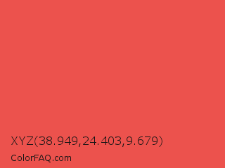 XYZ 38.949,24.403,9.679 Color is a light red color and the nearest color is Carmine Pink #eb4c42. Hex code #ec524d and RGB value is rgb(236,82,77). In RGB color space, this color is composed of 93% red, 32% green, 30% blue, In CMYK color space, this color is composed of 0% cyan, 65% magenta, 67% yellow , 7% black , In HSL color space, this color has a hue angle of 2° , 81% saturation and 61% lightness.