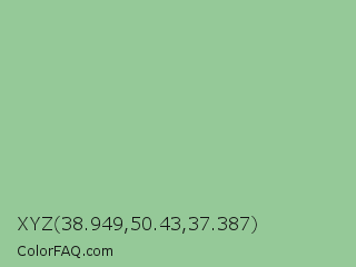 XYZ 38.949,50.43,37.387 Color is a light green color and the nearest color is Eton Blue #96c8a2. Hex code #95c998 and RGB value is rgb(149,201,152). In RGB color space, this color is composed of 58% red, 79% green, 60% blue, In CMYK color space, this color is composed of 26% cyan, 0% magenta, 24% yellow , 21% black , In HSL color space, this color has a hue angle of 123° , 33% saturation and 69% lightness.