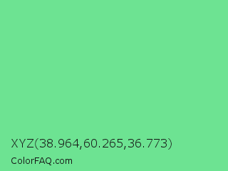 XYZ 38.964,60.265,36.773 Color is a light green color and the nearest color is Very Light Malachite Green #64e986. Hex code #6de392 and RGB value is rgb(109,227,146). In RGB color space, this color is composed of 43% red, 89% green, 57% blue, In CMYK color space, this color is composed of 52% cyan, 0% magenta, 36% yellow , 11% black , In HSL color space, this color has a hue angle of 139° , 68% saturation and 66% lightness.