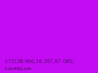 XYZ 38.966,18.397,87.085 Color is a normal purple color and the nearest color is Electric Purple #bf00ff. Hex code #c30cf4 and RGB value is rgb(195,12,244). In RGB color space, this color is composed of 76% red, 5% green, 96% blue, In CMYK color space, this color is composed of 20% cyan, 95% magenta, 0% yellow , 4% black , In HSL color space, this color has a hue angle of 287° , 91% saturation and 50% lightness.