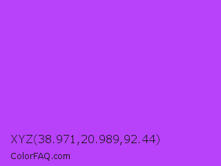 XYZ 38.971,20.989,92.44 Color is a light purple color and the nearest color is Veronica #a020f0. Hex code #b842fa and RGB value is rgb(184,66,250). In RGB color space, this color is composed of 72% red, 26% green, 98% blue, In CMYK color space, this color is composed of 26% cyan, 74% magenta, 0% yellow , 2% black , In HSL color space, this color has a hue angle of 278° , 95% saturation and 62% lightness.