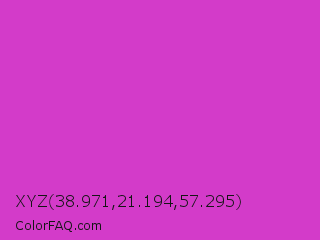 XYZ 38.971,21.194,57.295 Color is a normal magenta color and the nearest color is Steel Pink #cc33cc. Hex code #d33bc9 and RGB value is rgb(211,59,201). In RGB color space, this color is composed of 83% red, 23% green, 79% blue, In CMYK color space, this color is composed of 0% cyan, 72% magenta, 5% yellow , 17% black , In HSL color space, this color has a hue angle of 304° , 63% saturation and 53% lightness.