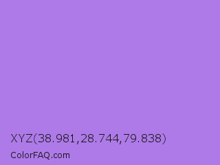 XYZ 38.981,28.744,79.838 Color is a light violet color and the nearest color is Lavender #b57edc. Hex code #ae7ae8 and RGB value is rgb(174,122,232). In RGB color space, this color is composed of 68% red, 48% green, 91% blue, In CMYK color space, this color is composed of 25% cyan, 47% magenta, 0% yellow , 9% black , In HSL color space, this color has a hue angle of 268° , 71% saturation and 69% lightness.