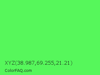 XYZ 38.987,69.255,21.21 Color is a light green color and the nearest color is Screamin Green #66ff66. Hex code #56f75b and RGB value is rgb(86,247,91). In RGB color space, this color is composed of 34% red, 97% green, 36% blue, In CMYK color space, this color is composed of 65% cyan, 0% magenta, 63% yellow , 3% black , In HSL color space, this color has a hue angle of 122° , 91% saturation and 65% lightness.