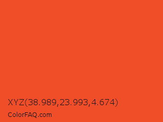 XYZ 38.989,23.993,4.674 Color is a normal red color and the nearest color is Flamingo #f2552a. Hex code #f04d29 and RGB value is rgb(240,77,41). In RGB color space, this color is composed of 94% red, 30% green, 16% blue, In CMYK color space, this color is composed of 0% cyan, 68% magenta, 83% yellow , 6% black , In HSL color space, this color has a hue angle of 11° , 87% saturation and 55% lightness.