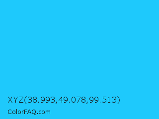 XYZ 38.993,49.078,99.513 Color is a normal blue color and the nearest color is Spiro Disco Ball #0fc0fc. Hex code #1ec9fc and RGB value is rgb(30,201,252). In RGB color space, this color is composed of 12% red, 79% green, 99% blue, In CMYK color space, this color is composed of 88% cyan, 20% magenta, 0% yellow , 1% black , In HSL color space, this color has a hue angle of 194° , 97% saturation and 55% lightness.