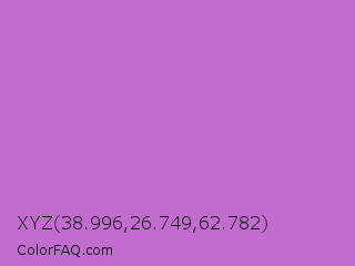 XYZ 38.996,26.749,62.782 Color is a light magenta color and the nearest color is Rich Lilac #b666d2. Hex code #c26cd0 and RGB value is rgb(194,108,208). In RGB color space, this color is composed of 76% red, 42% green, 82% blue, In CMYK color space, this color is composed of 7% cyan, 48% magenta, 0% yellow , 18% black , In HSL color space, this color has a hue angle of 292° , 52% saturation and 62% lightness.