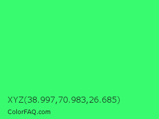 XYZ 38.997,70.983,26.685 Color is a normal green color and the nearest color is UFO Green #3cd070. Hex code #38fb6f and RGB value is rgb(56,251,111). In RGB color space, this color is composed of 22% red, 98% green, 44% blue, In CMYK color space, this color is composed of 78% cyan, 0% magenta, 56% yellow , 2% black , In HSL color space, this color has a hue angle of 137° , 96% saturation and 60% lightness.