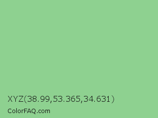 XYZ 38.99,53.365,34.631 Color is a light green color and the nearest color is Dark Sea Green #8fbc8f. Hex code #8ed190 and RGB value is rgb(142,209,144). In RGB color space, this color is composed of 56% red, 82% green, 56% blue, In CMYK color space, this color is composed of 32% cyan, 0% magenta, 31% yellow , 18% black , In HSL color space, this color has a hue angle of 122° , 42% saturation and 69% lightness.