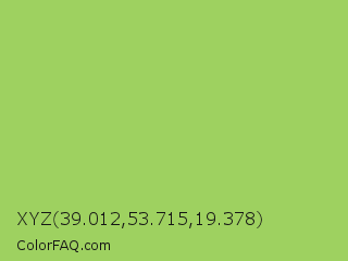 XYZ 39.012,53.715,19.378 Color is a normal green color and the nearest color is Middle Green Yellow #acbf60. Hex code #9ed160 and RGB value is rgb(158,209,96). In RGB color space, this color is composed of 62% red, 82% green, 38% blue, In CMYK color space, this color is composed of 24% cyan, 0% magenta, 54% yellow , 18% black , In HSL color space, this color has a hue angle of 87° , 55% saturation and 60% lightness.