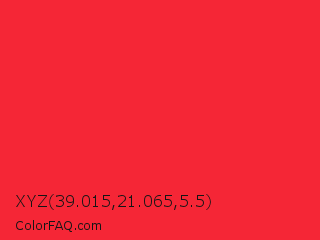 XYZ 39.015,21.065,5.5 Color is a normal red color and the nearest color is Imperial Red #ed2939. Hex code #f52636 and RGB value is rgb(245,38,54). In RGB color space, this color is composed of 96% red, 15% green, 21% blue, In CMYK color space, this color is composed of 0% cyan, 84% magenta, 78% yellow , 4% black , In HSL color space, this color has a hue angle of 355° , 91% saturation and 55% lightness.