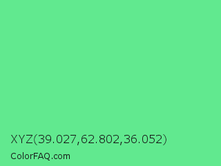 XYZ 39.027,62.802,36.052 Color is a light green color and the nearest color is Very Light Malachite Green #64e986. Hex code #61e98f and RGB value is rgb(97,233,143). In RGB color space, this color is composed of 38% red, 91% green, 56% blue, In CMYK color space, this color is composed of 58% cyan, 0% magenta, 39% yellow , 9% black , In HSL color space, this color has a hue angle of 140° , 76% saturation and 65% lightness.